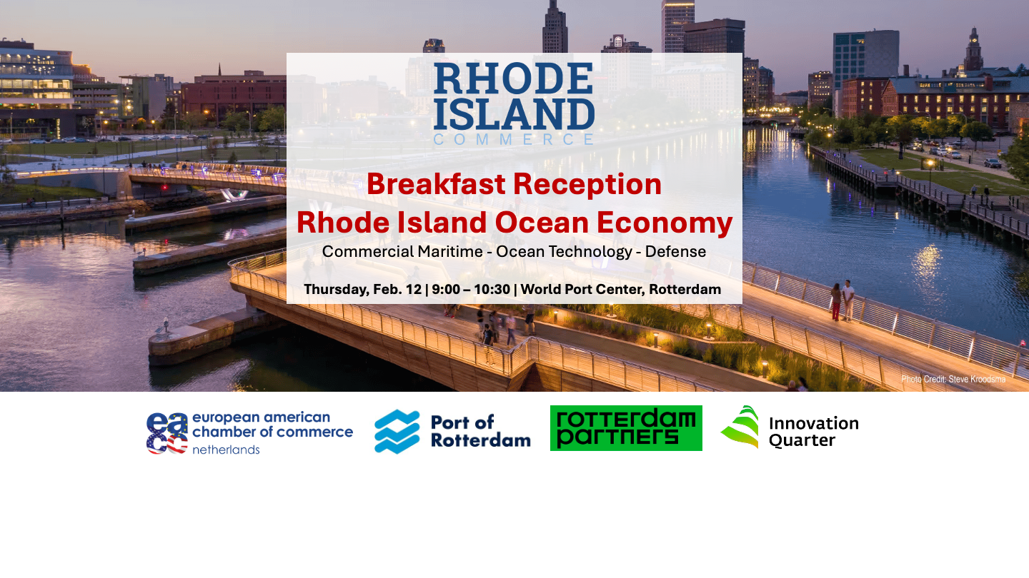 The Rhode Island Commerce Corporation is pleased to invite you to the Rhode Island Ocean Economy Breakfast Reception at the offices of Port of Rotterdam (World Port Center) bringing together leaders across Europe’s commercial maritime, ocean technology, and defense sectors to explore collaboration with one of the United States’ most dynamic ocean economies.